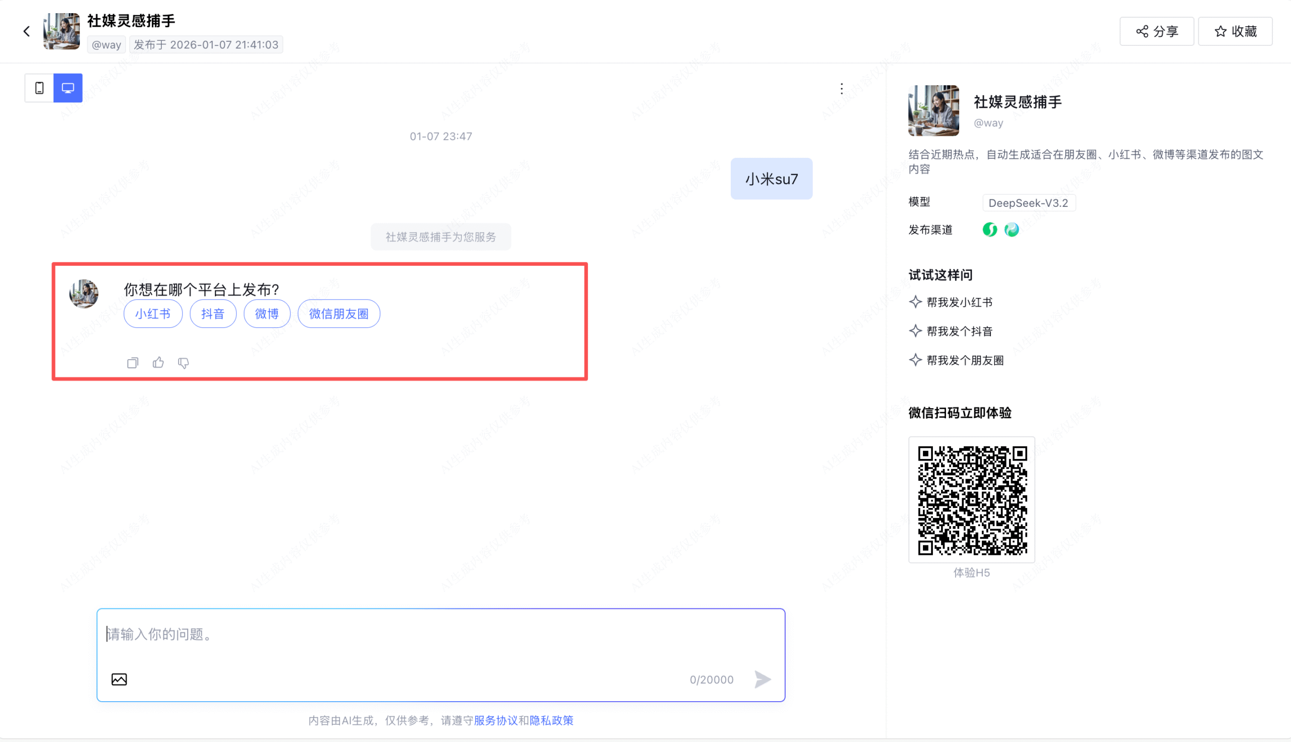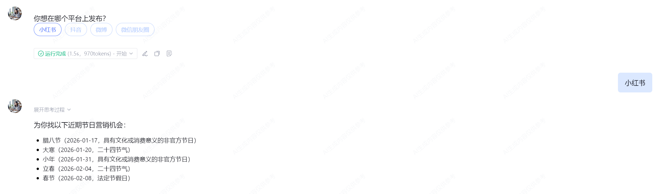 Step1:用户发送产品名称后,Agent跟确认用户想要发布的内容平台