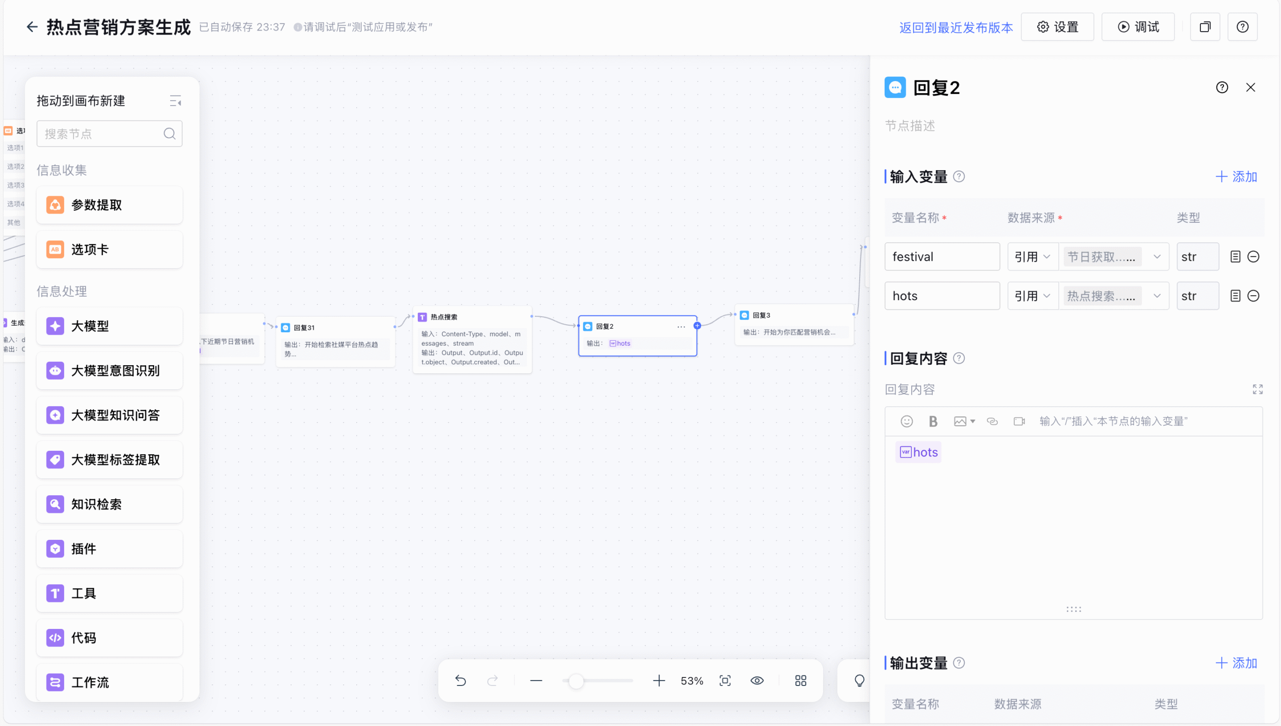 回复的内容可以引入变量,这样就能把每一个环节的生成内容作为局部信息,持续地传递给用户: