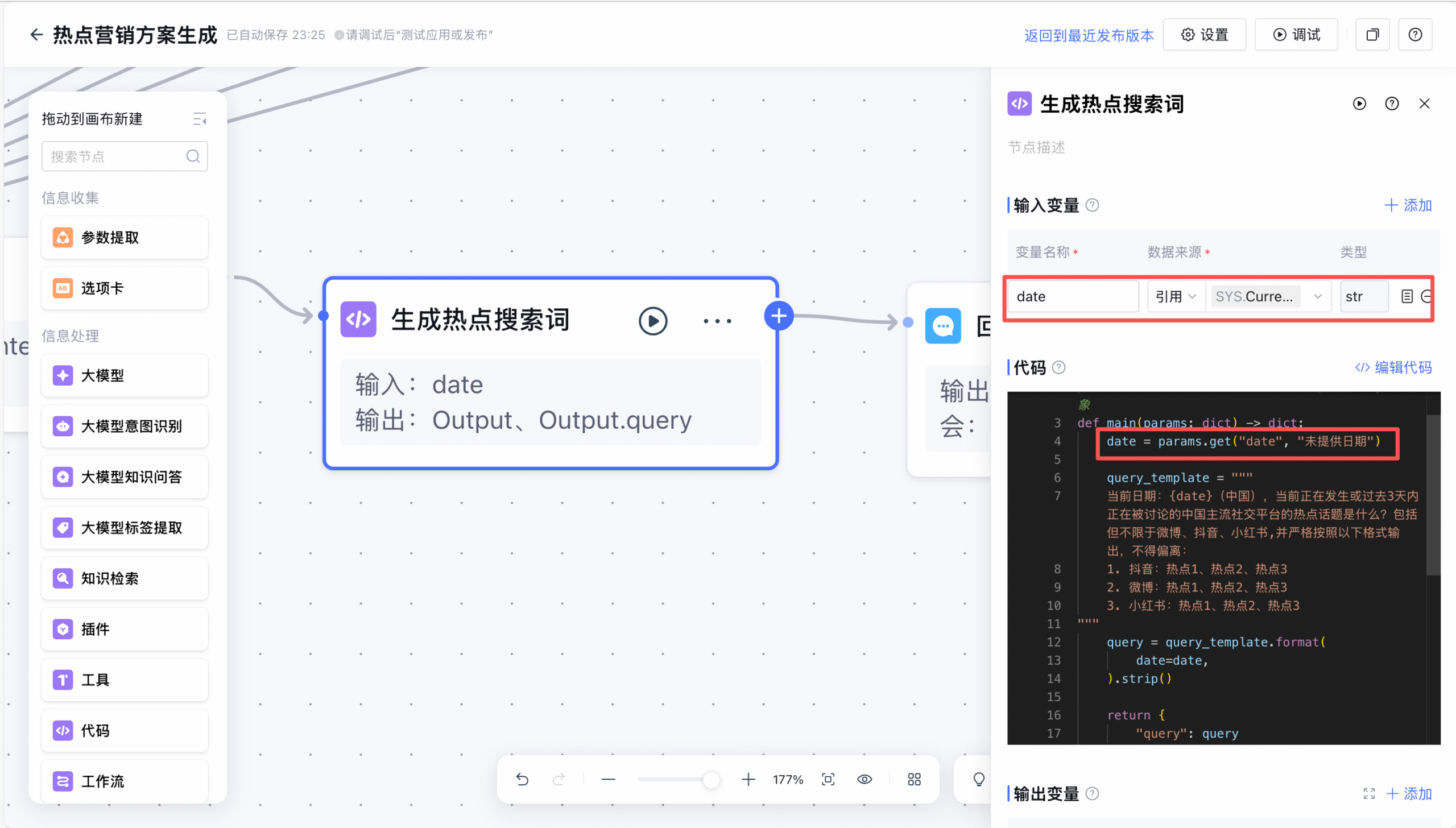 2)社媒平台热点信息获取:为了让搜索总结出的内容时效性更强,我在 ai 搜索前,先通过代码节点去生成搜索词,在搜索词中引入用户的互动时间: