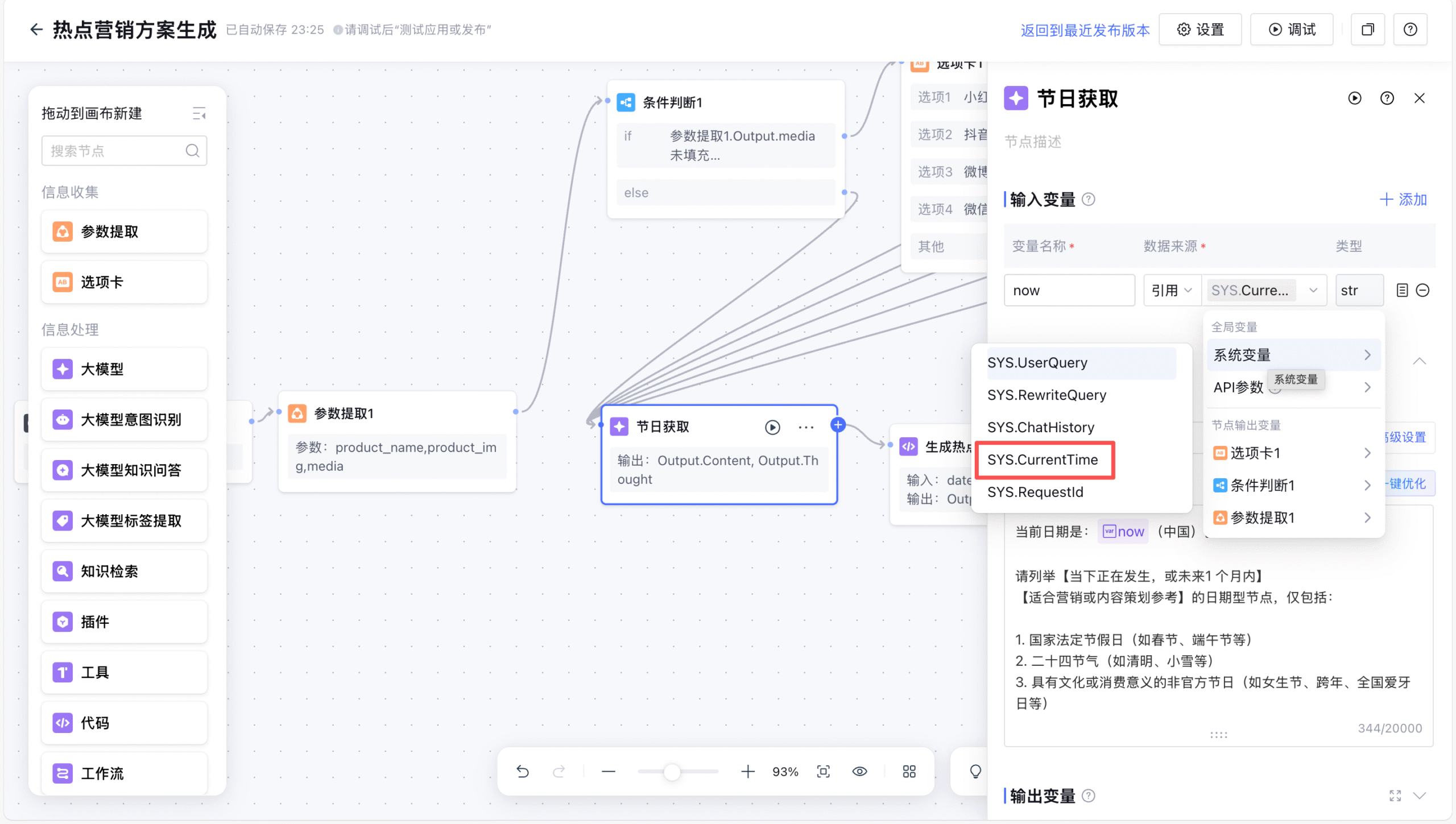 在腾讯元器上,我使用了系统变量里的 SYS.CurrentTime,在 prmopt 中明确告知大模型时间信息,从而让它获取到有效的热点内容: