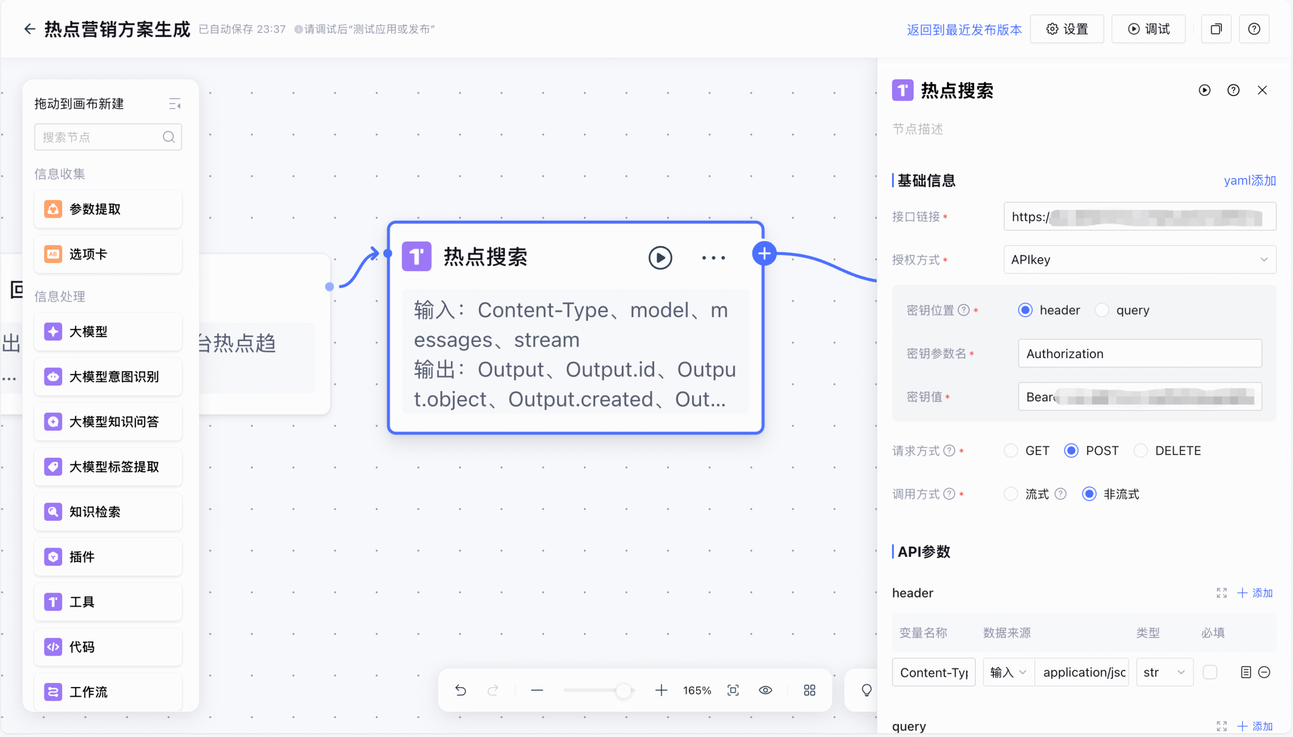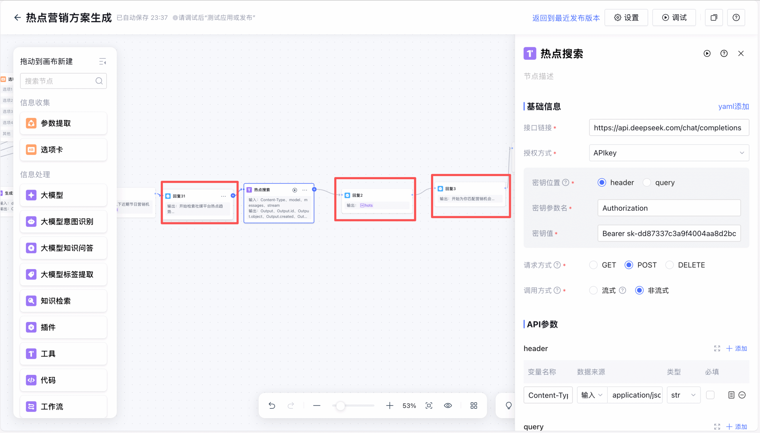 生成搜索词后,我通过 api 直接调用大模型来进行搜索总结,这里我使用的是自己的服务,所以通过腾讯元器的工具节点来进行调用: