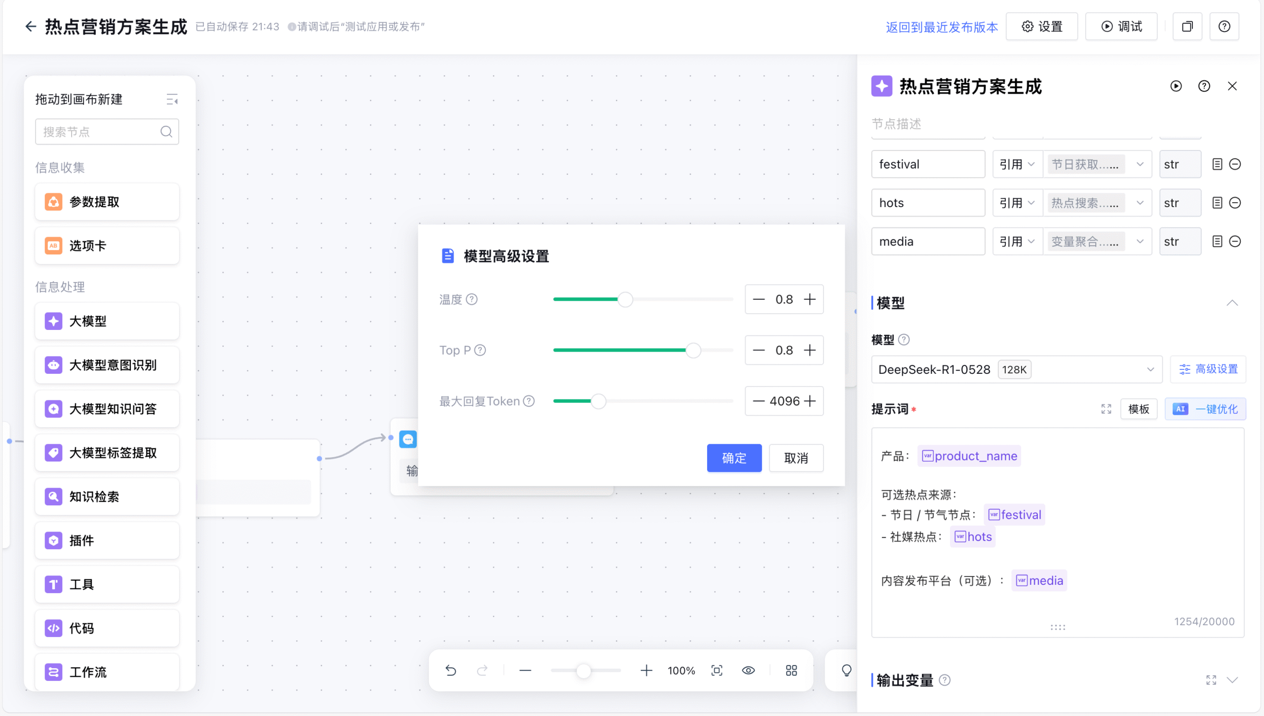 目前腾讯元器上大模型节点支持选择来自DeepSeek、腾讯混元、腾讯优图提供的多种模型,也支持结合应用场景需求对温度等参数进行调整,在这里面我希望生成的创意方案更多样化,所以把温度、Top P 等值都进行了调整: