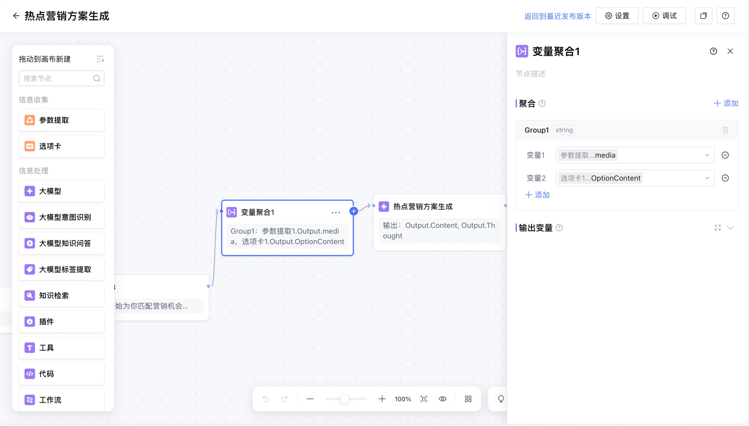 引入选项卡后,会出现发布平台这个上下文信息点,会在工作流中的 2 个节点被收集,分别是参数提取、选项卡节点,出现这种同一上下文多次收集的情况,这个时候可以通过腾讯元器的变量聚合节点来解决,可以通过设置取值优先级,实现当 query中有提及就从 query 取,query 没提及就从选项卡取。这个节点的引入,也有效降低了整个工作流的复杂度。