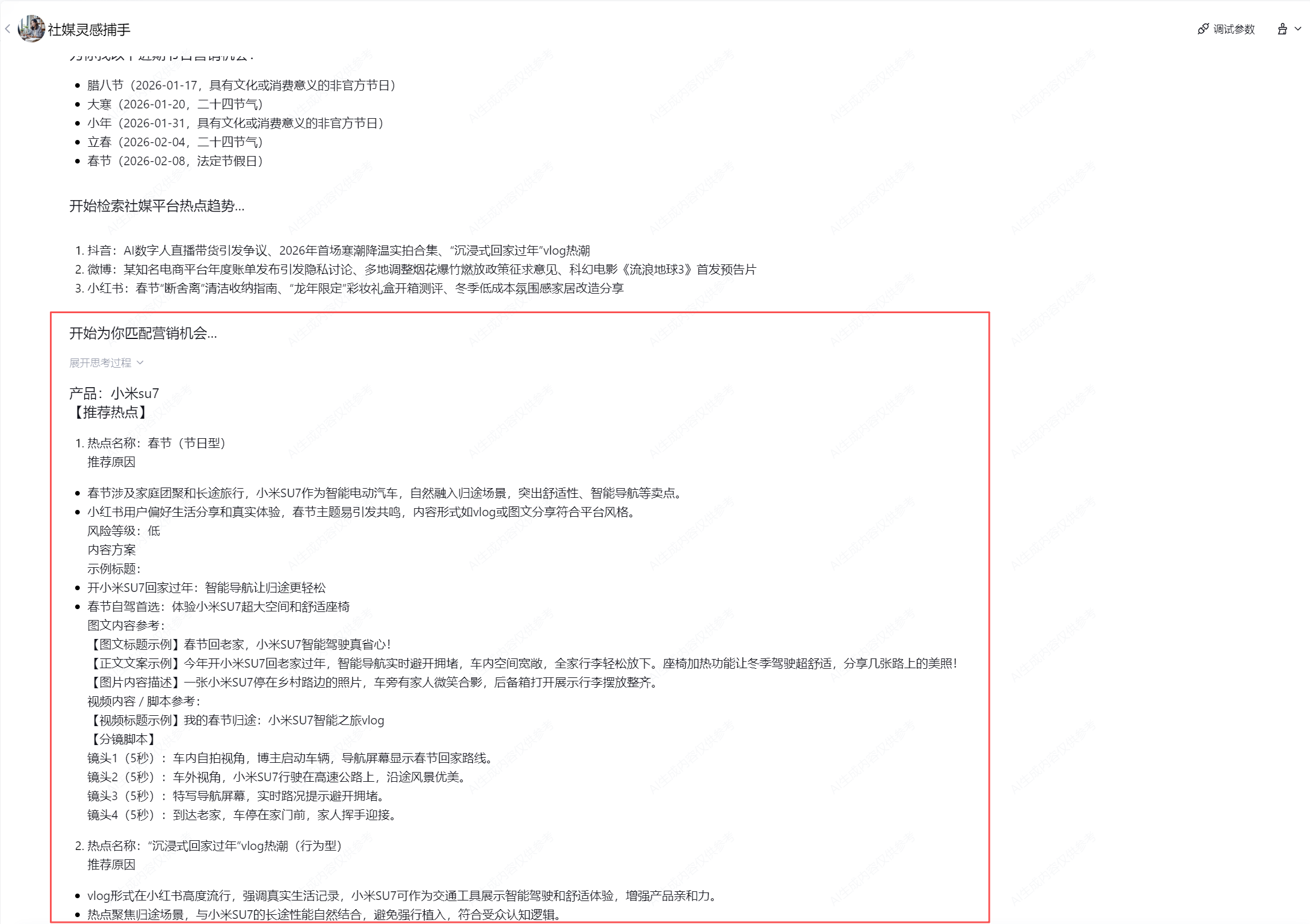 当时间、需求和热点这三类信息都被清楚地交代给 Agent 之后,后续的判断与创意生成,反而变得简单且可控。