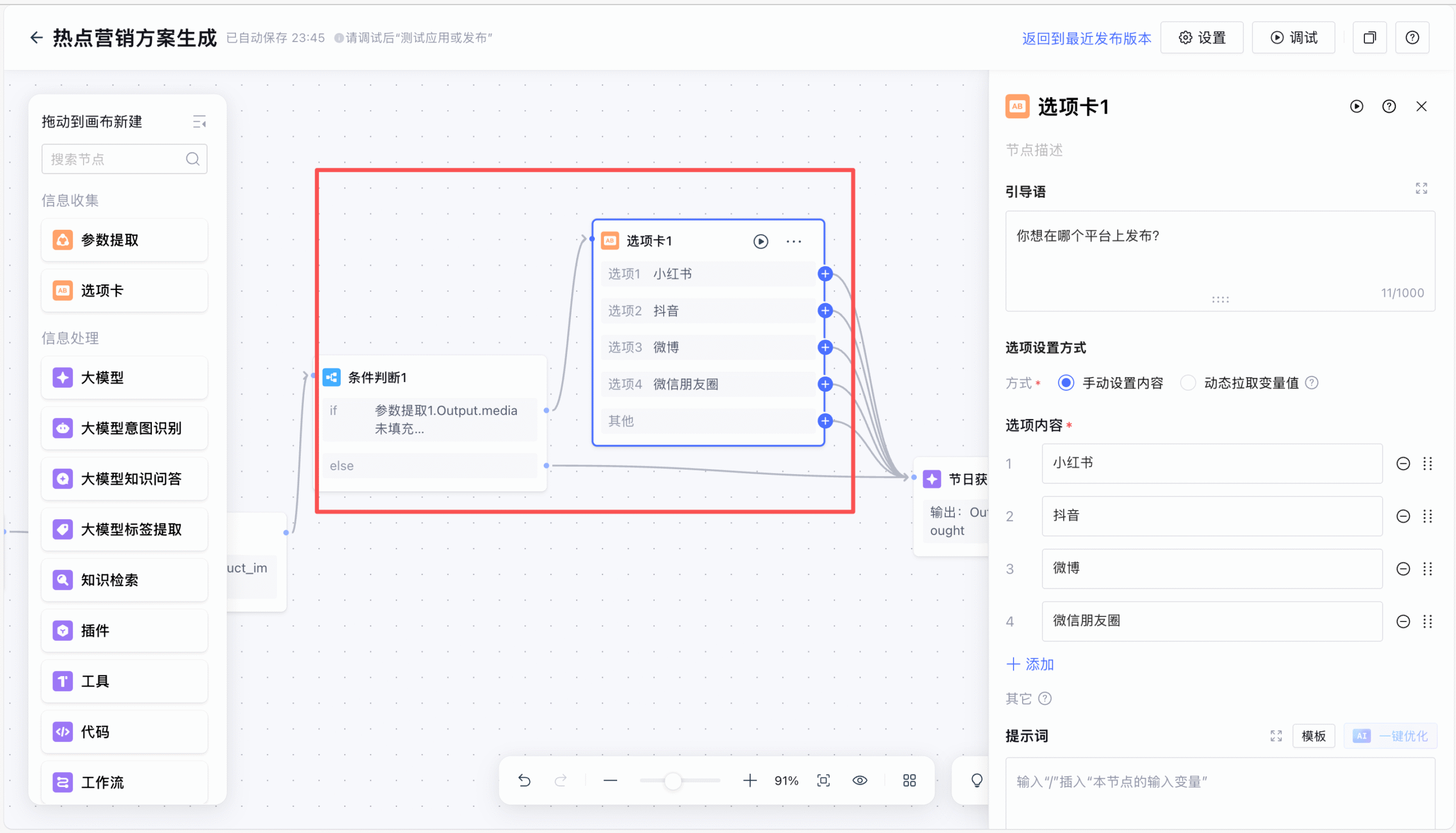 当然,也可以用腾讯元器的选项卡节点,提供一些选项给到用户来收集信息,比如我在工作流里面就先通过条件判断节点,当提取不到特定参数时发选项卡给用户,让用户选择希望发布的平台: