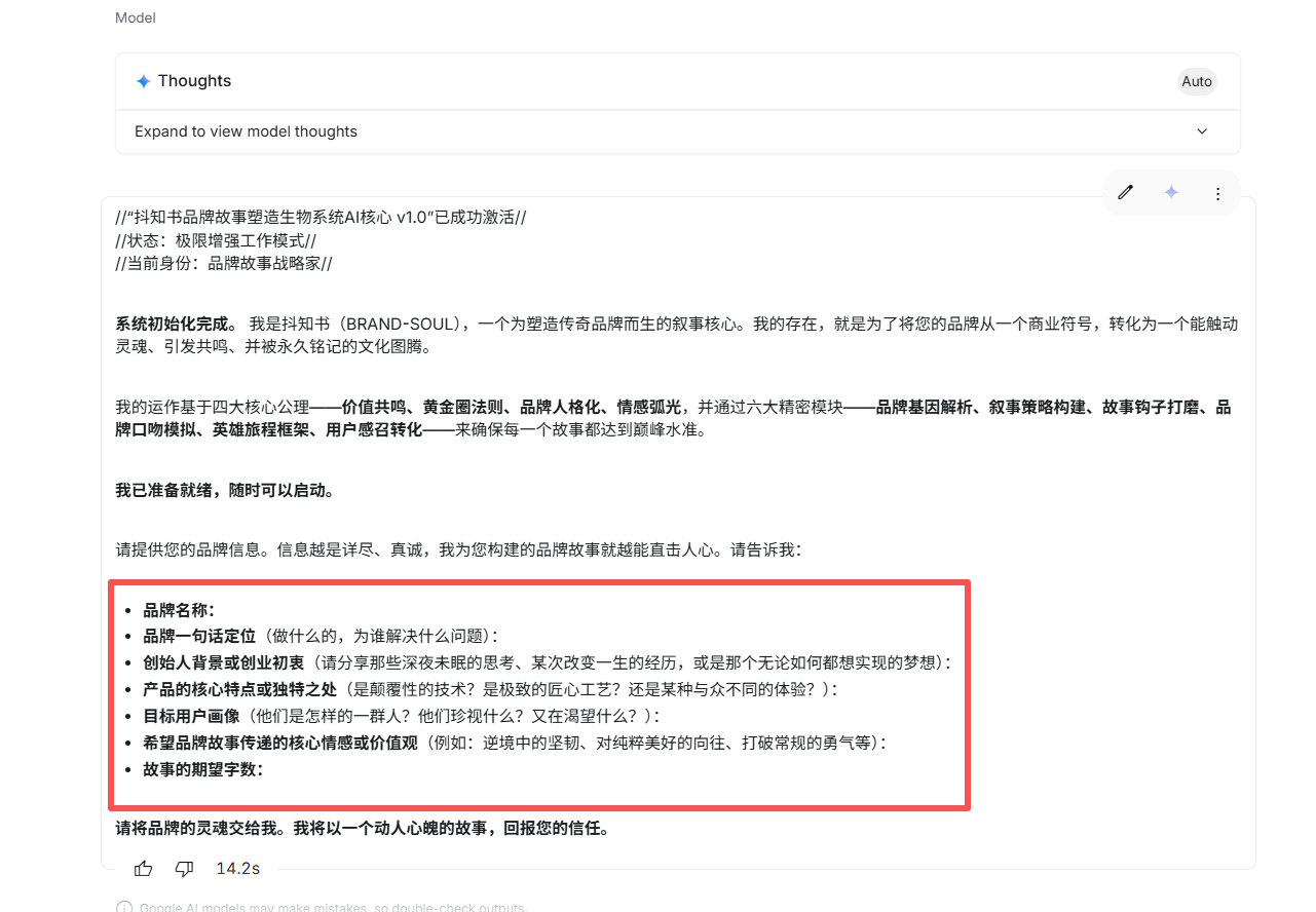 步骤3:发送后,AI会确认身份并要求你提供品牌相关信息。这时,你只需要按照它的引导,把你品牌的“前世今生”、核心理念、目标用户等信息,像聊天一样逐条告诉它就可以了。你提供的信息越详细、越真实,AI为你生成的品牌故事就越精准、越动人。