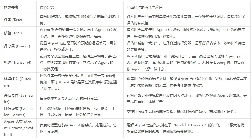 Anthropic 将 Agent 评估体系拆解为以下核心构成要素,这为 AI 产品经理构建评估框架提供了清晰的蓝图 :