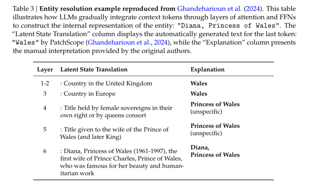 模型需要经过6层才能完成这个识别过程,前几层还在纠结”Wales是英国的一个地区”、”Princess of Wales是某种头衔”这些中间状态,最终才能“想起来”这是指戴安娜王妃。
