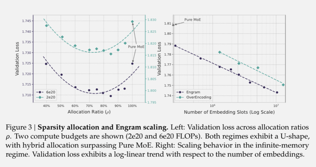 纯MoE反而不是最优解,把大约20%到25%的稀疏参数预算分给Engram记忆时,模型验证集loss达到最低点。