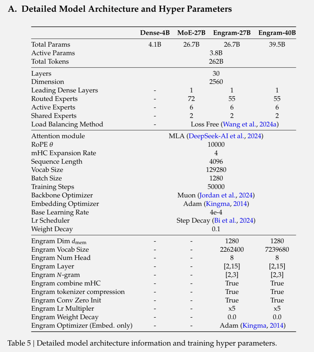 Engram-27B:MoE+Engram混合模型,55个路由专家+2个共享专家,把5.7B稀疏参数分配给Engram记忆模块。