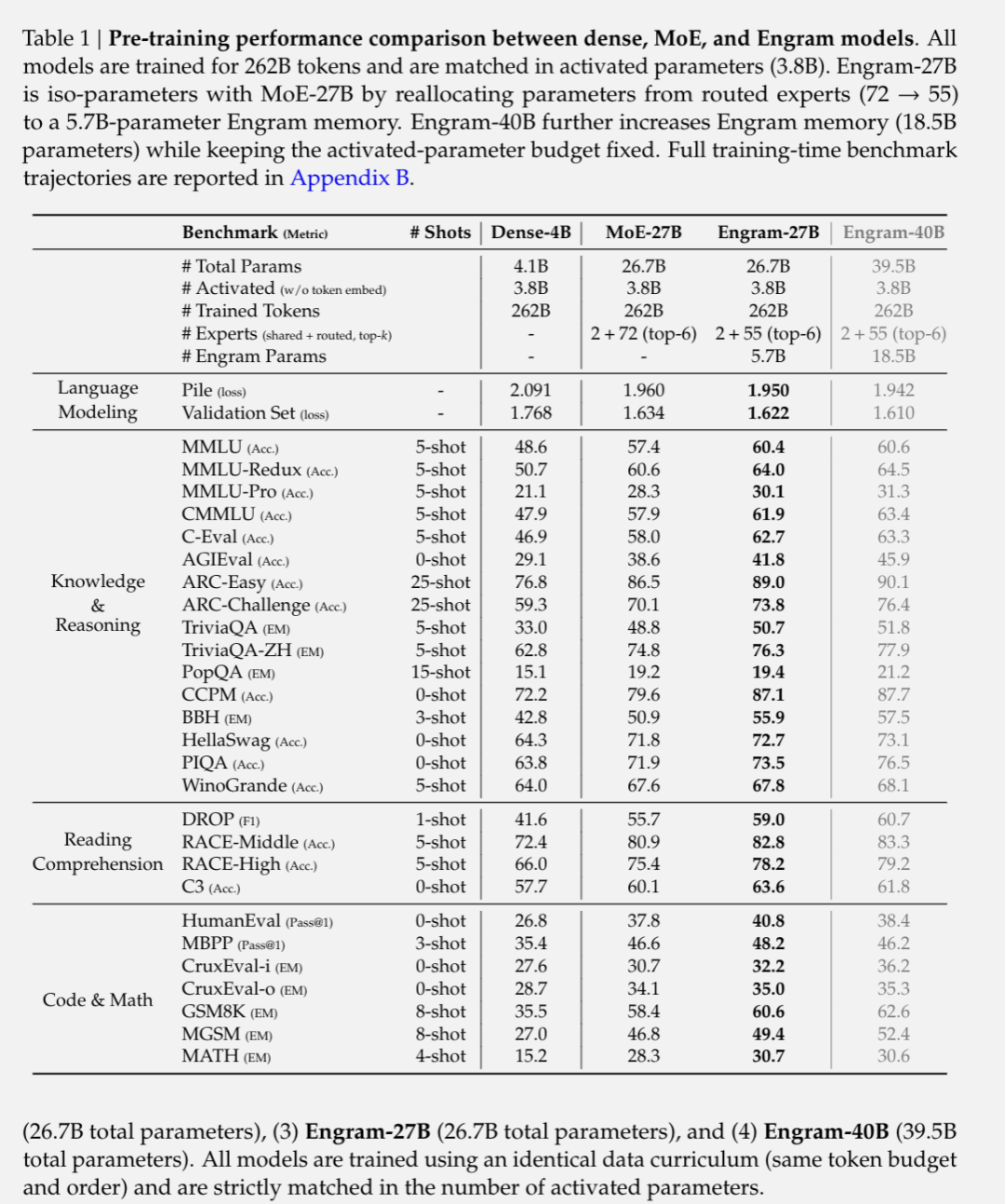 Engram-40B:进一步扩展Engram模块,保持专家数量不变,Engram记忆参数增至 18.5B,总参数39.5B。