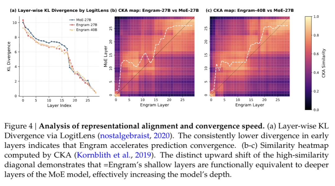 Engram让模型的早期层不再需要做特征组合的“苦力活”,KL散度曲线显示Engram模型的预测收敛速度明显更快。更直观的证据来自CKA相似度矩阵,Engram-27B第5层的表征,和MoE基线第12层的表征最为相似。