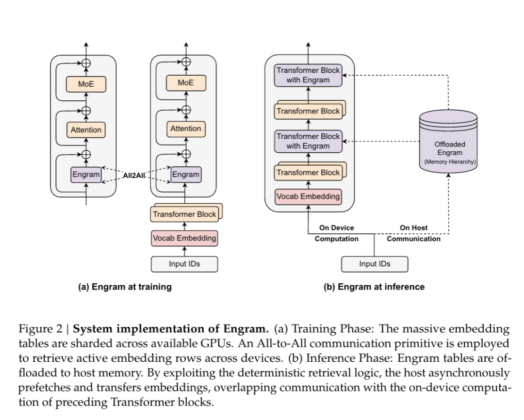 和MoE的动态路由不同,Engram的查找索引只取决于输入token序列,完全可以提前计算。