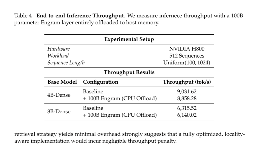 实验直接把一个1000亿参数的Engram表放到CPU内存,在H800上跑推理。4B密集模型的吞吐量从9031 token/s降到8858 token/s,8B Dense模型从6315 token/s降到6140 token/s,额外开销都在3%以内。
