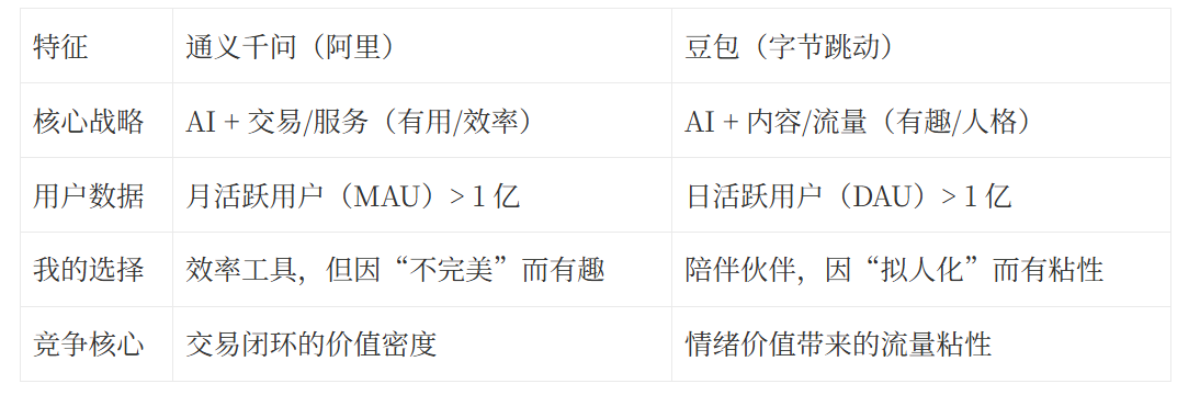 通义千问与豆包的竞争,是两种产品哲学的对决: