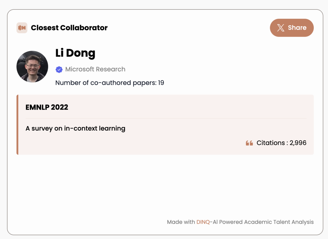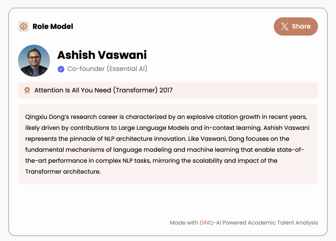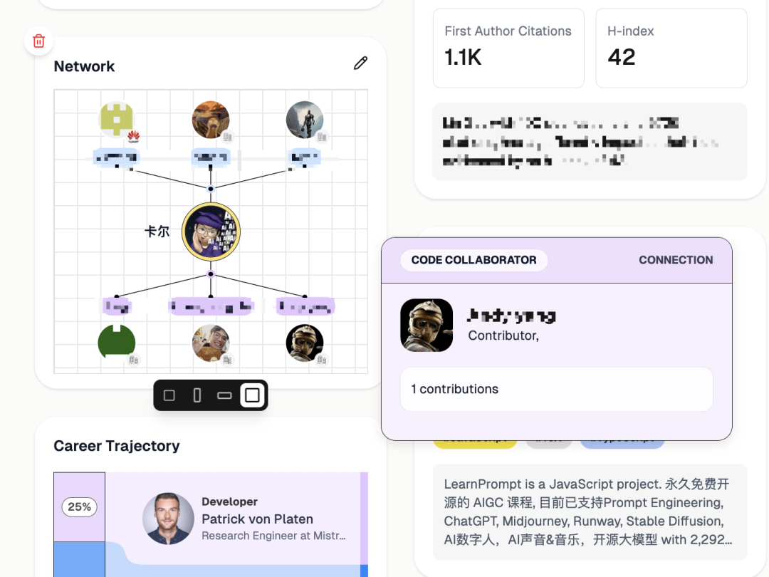 DINQ 先是基于我的公开信息和写入的链接,把我更偏向哪类角色做一个归类,比如开发者,创始人,研究员。这里的角色不是我简历上填的职位名,是它从经历,产出,影响力,合作关系(也就是刚刚的人脉图谱)里推断出来的职业原型。