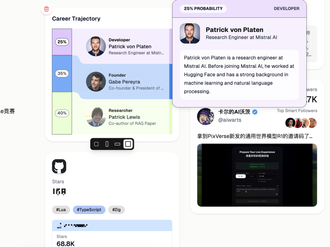 它通过聚合你在各个平台的输出,来构建一个更丰富的信号源。我要做的,就是上传一份简历,再把日常输出的链接,比如GitHub、arXiv、X、领英都打包进来。它会花点时间,把这些年散落在各个角落的经历给串联起来。