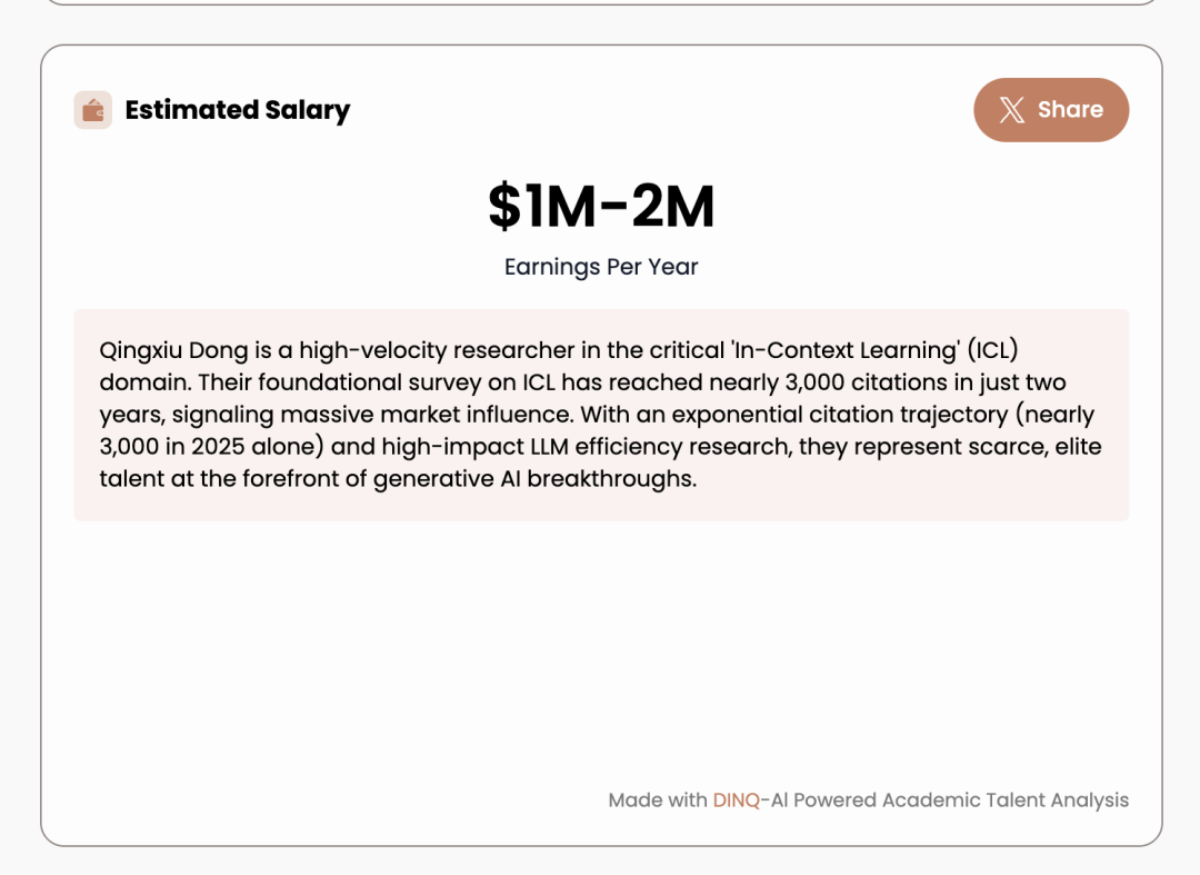找到跟他合作最多的人脉后,还可以生成一个研究报告,看起来非常像另一版本的DINQ Card,甚至给人薪资估算出来了。。。