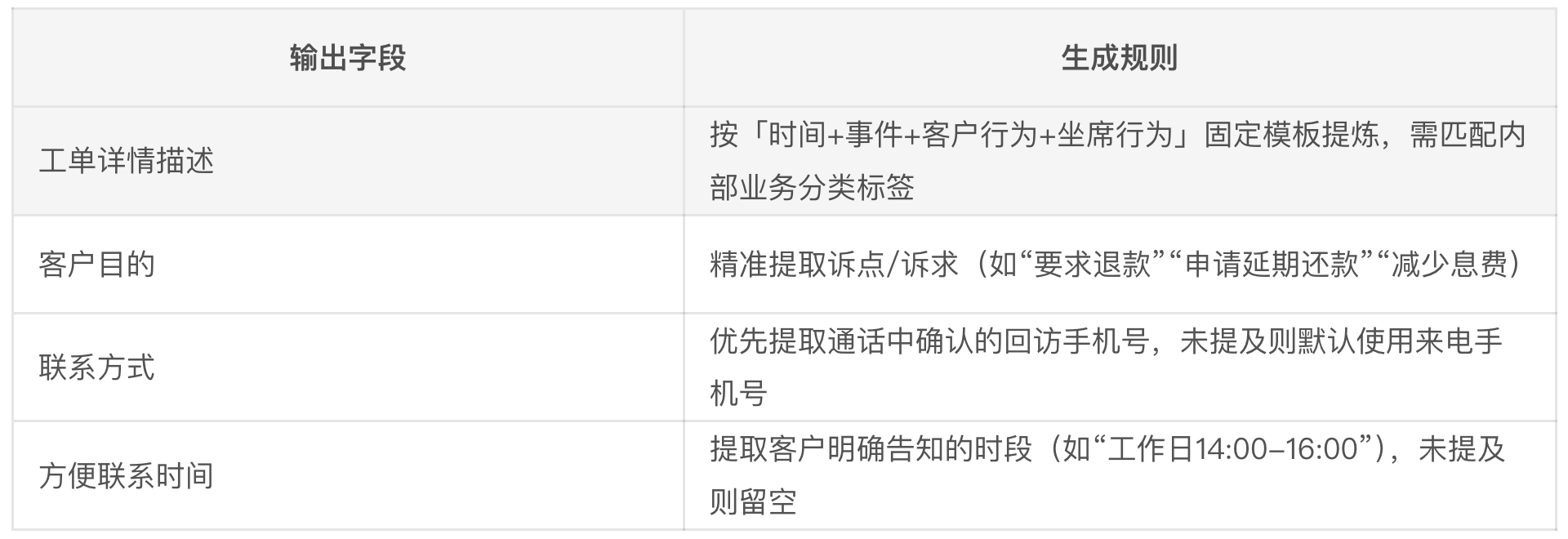 - 规则引擎校验:对AI输出做格式约束(如时间必须为「YYYY-MM-DD HH:MM」、联系方式必须为11位手机号或「来电手机号」);
