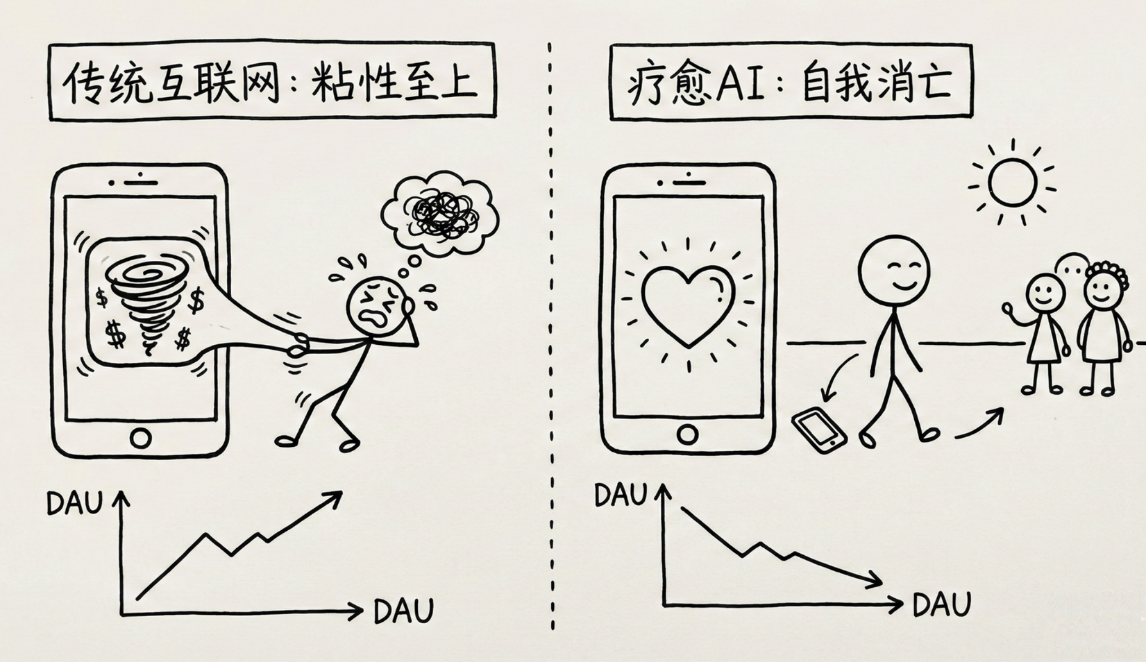 最具颠覆性的观点是:对于疗愈类AI陪伴产品,DAU下降可能是成功的标志。如果AI真正帮助用户缓解了焦虑、走出了情绪低谷,用户自然会减少使用频率,将更多精力投入现实生活。这种 “自我消亡” 的产品逻辑,完全颠覆了传统互联网 “用户粘性至上” 的思维定式。