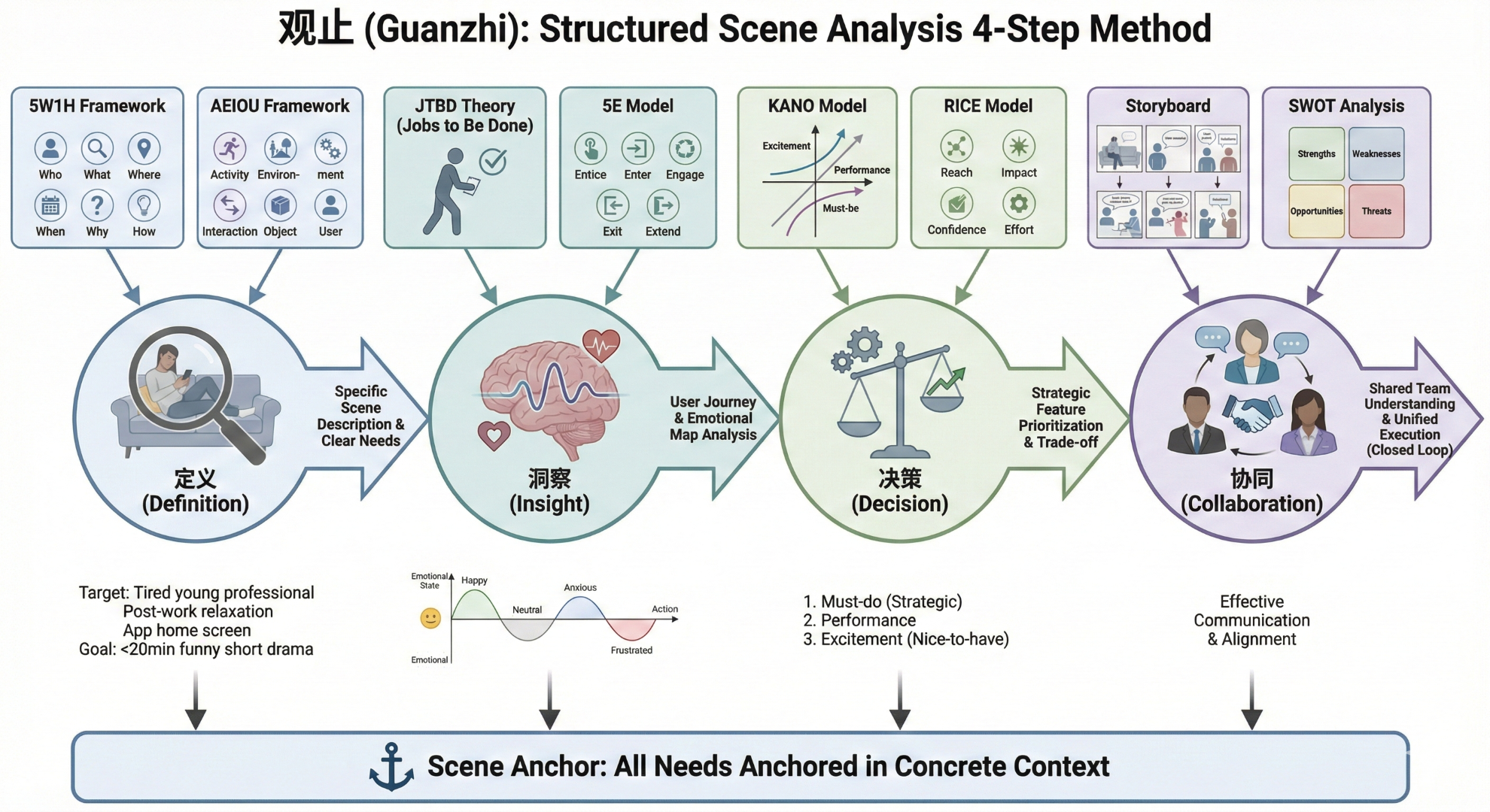 这四步连起来,就是“观止”的核心。它的思想很简单,就是把所有的需求分析,都死死地锚定在“具体场景”这个基石上。离开场景谈需求,都是耍流氓,尤其是在AI时代。