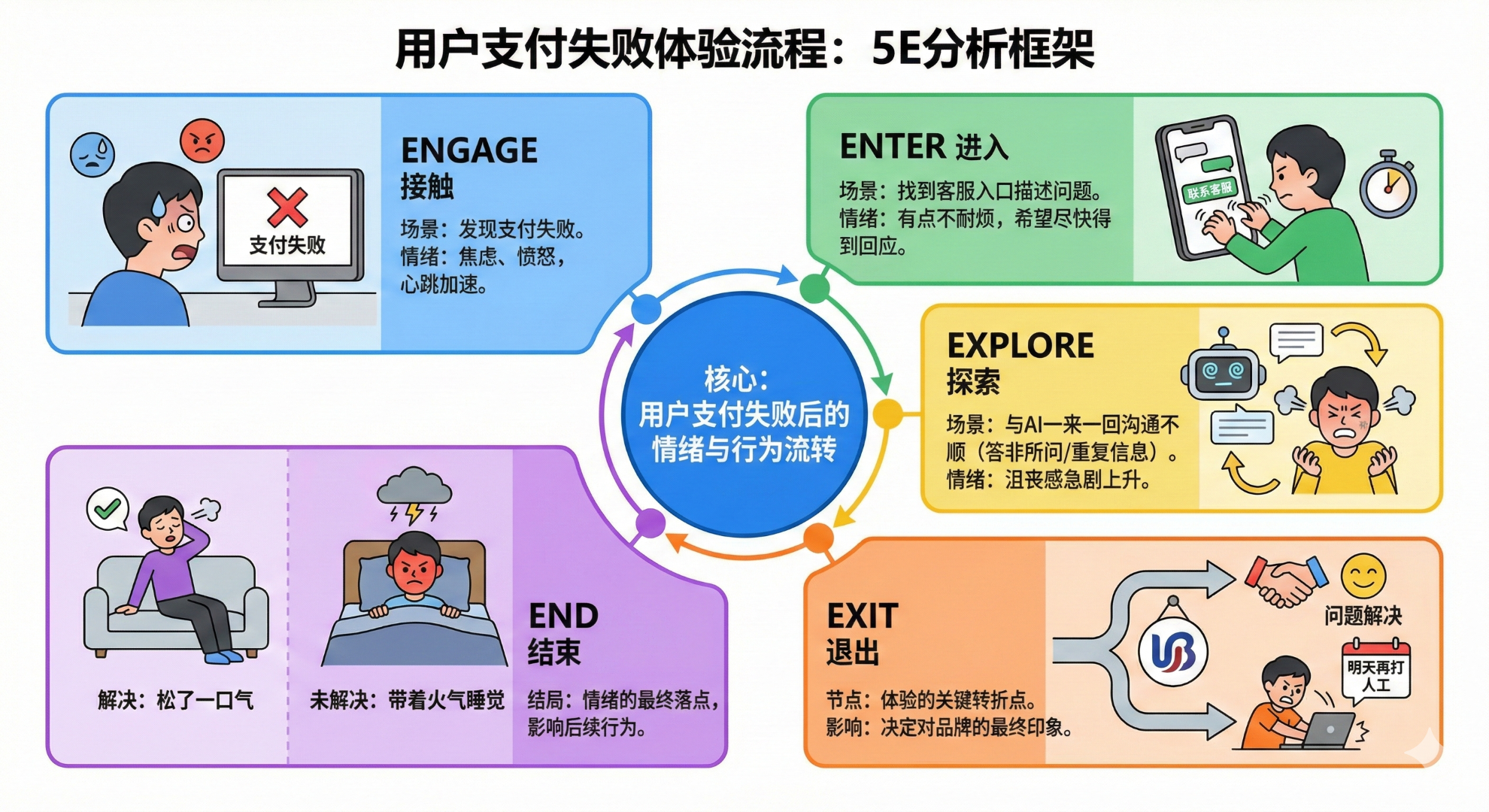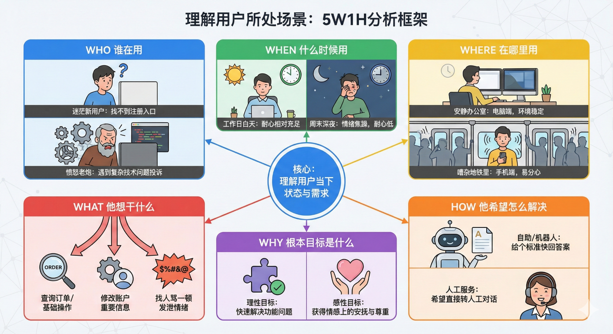 你看,这么一问,一个模糊的“智能客服”就被拆解成了无数个具体的场景。比如,“一个老用户,在周末深夜,用手机,想解决一个复杂的支付失败问题,他的目标是尽快挽回损失,他希望有人能立刻给他一个明确的解决方案”。这个场景就非常具体,可分析,可设计。