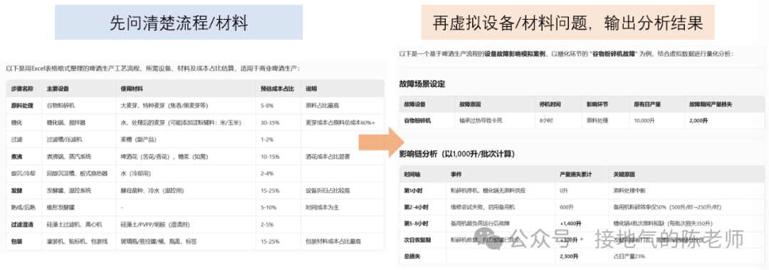 比如对方是著名啤酒企业+要求“生产情况进行分析”,我们已知:生产主指标是产量/质量/成本,但是并不知道到底啤酒是怎么生产的,也不知道具体成本构成。此时可以分两步提问。
