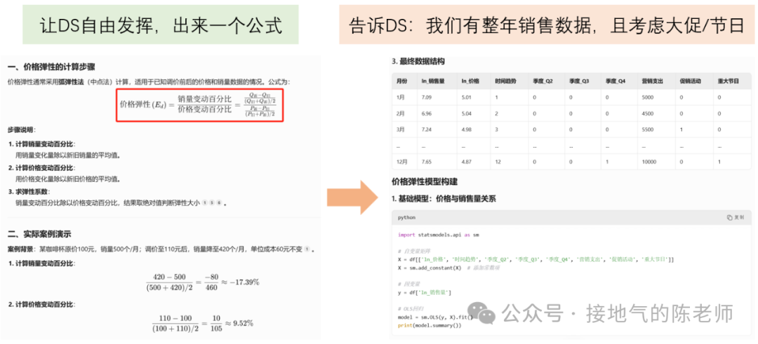 比如,都是“价格弹性如何计算”。如果不加限制,DS会给一个简单的计算公式。但是如果给出自己完整的数据格式,又有新的解决方案(如下图)