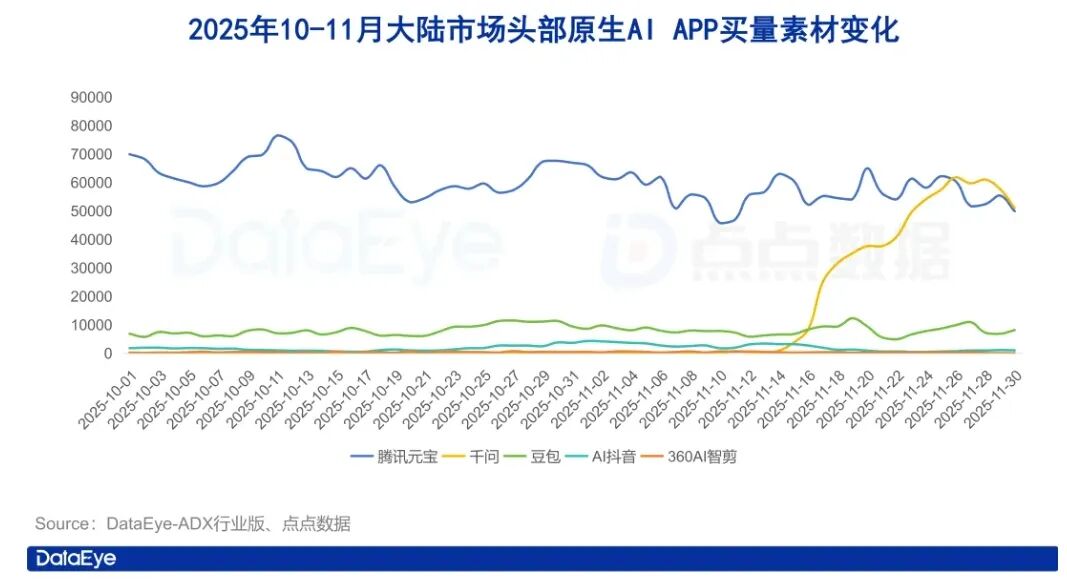 字节:整个2025年除1月之外,豆包投放量均排名前三。据DataEye研究院和点点数据的联合统计,2月是一个小高潮,投放量同比增长129.6%,这或许是为了应对元宝突然发起的猛攻。此外,同属字节旗下的猫箱、小云雀也不时发力,猫箱11月投放量大涨81.75%,小云雀则在10月跻身DataEye研究院AI应用月度买量榜TOP 10。