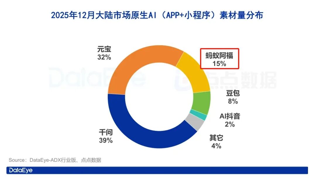 蚂蚁:后程发力,蚂蚁阿福12月投放量空降月度买量榜前三、一举反超豆包,单月共投放了超17万组素材,占该月AI应用素材投放量的15%。(数据来源:DataEye)