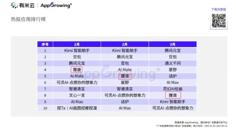 狸谱2025年1-3月投放量均位居热投应用排行榜前十
