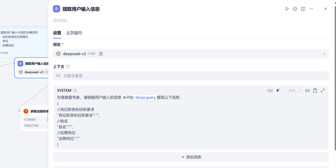 (说明:正常用户会上传简历和输入岗位职责,但因用户输入的信息也是随机的,所以我用了LLM节点提取岗位职责信息并结构化输出)