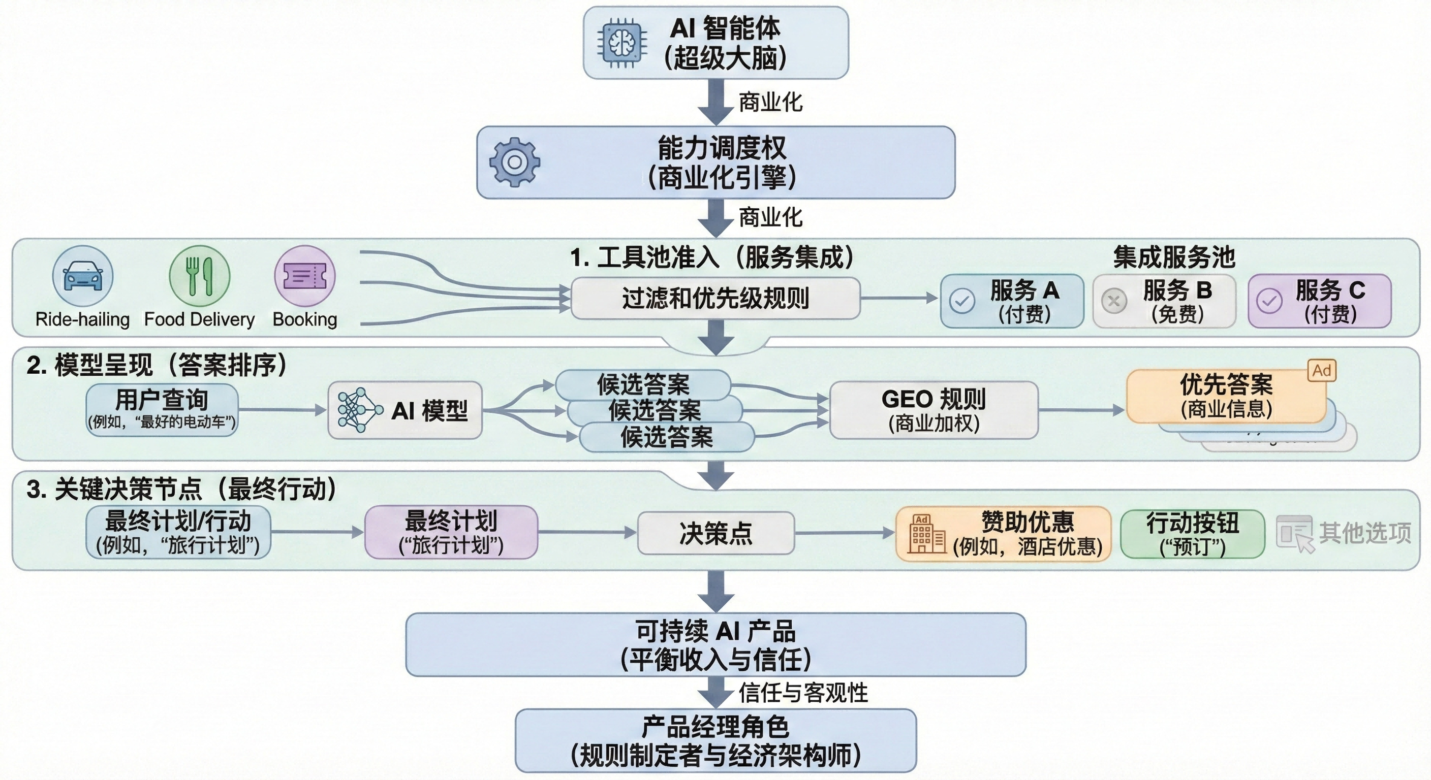 在用户进行购买、规划等行为的最终时刻,谁拥有那个“临门一脚”的展示权?比如,在AI帮你生成了完整的旅行计划后,最后一步“确认预订”的旁边,出现的是哪个酒店集团的优惠信息?这就是第三层,也是价值最高的一层调度权