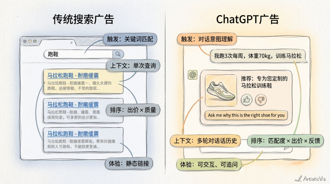 举个例子,一个卖专业马拉松跑鞋的品牌,和一个卖入门级跑鞋的品牌。在传统搜索里,用户搜“跑鞋”,可能出价高的专业品牌会排在前面。但在AI对话里,当用户说“我是新手,预算有限,想开始跑步”,AI可能会判断入门级跑鞋更匹配用户的意图,即便它出价更低,也可能获得更好的展示位置