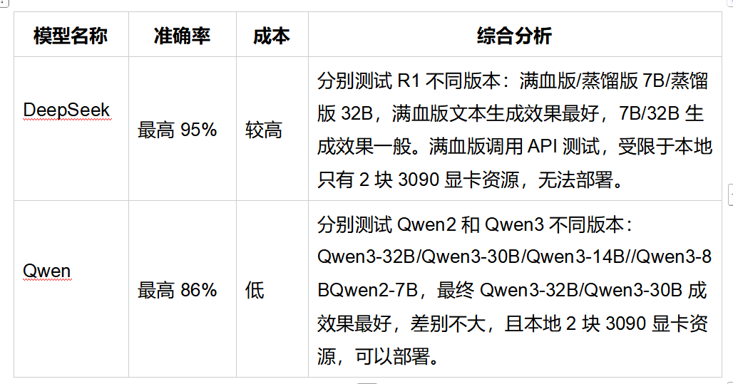 最终选型:Qwen3-30B,本地部署,性价比最高。如后期客户有更多的GPU资源投入,可再考虑部署DeepSeek-R1。