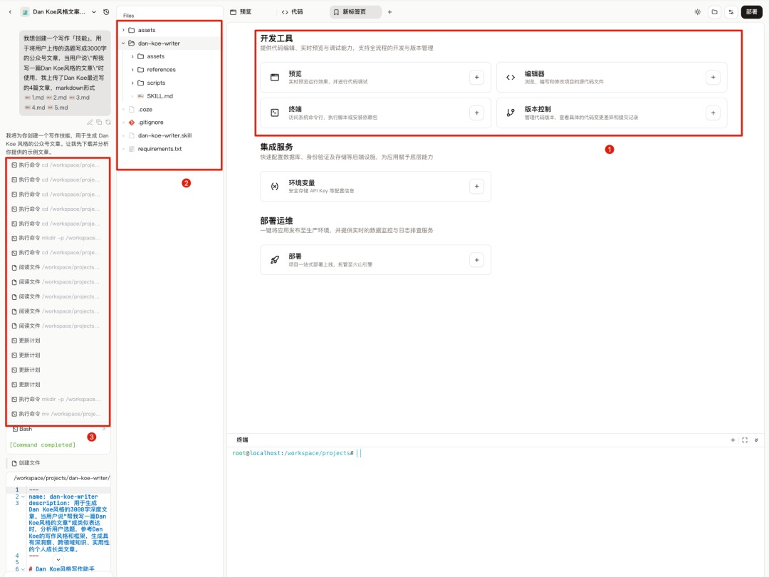 第二次看 Coze 生成 Skill 的全过程,其实能看到它在云端建了一个沙箱,新建一个符合Claude Code标准的Skill目录,阅读我们的需求来更新开发计划,执行命令,测试命令(即我们对应的 Skill)是否能够正常运行,基本上就是跟一个云上的开发器没什么两样,有编辑器,终端和预览。