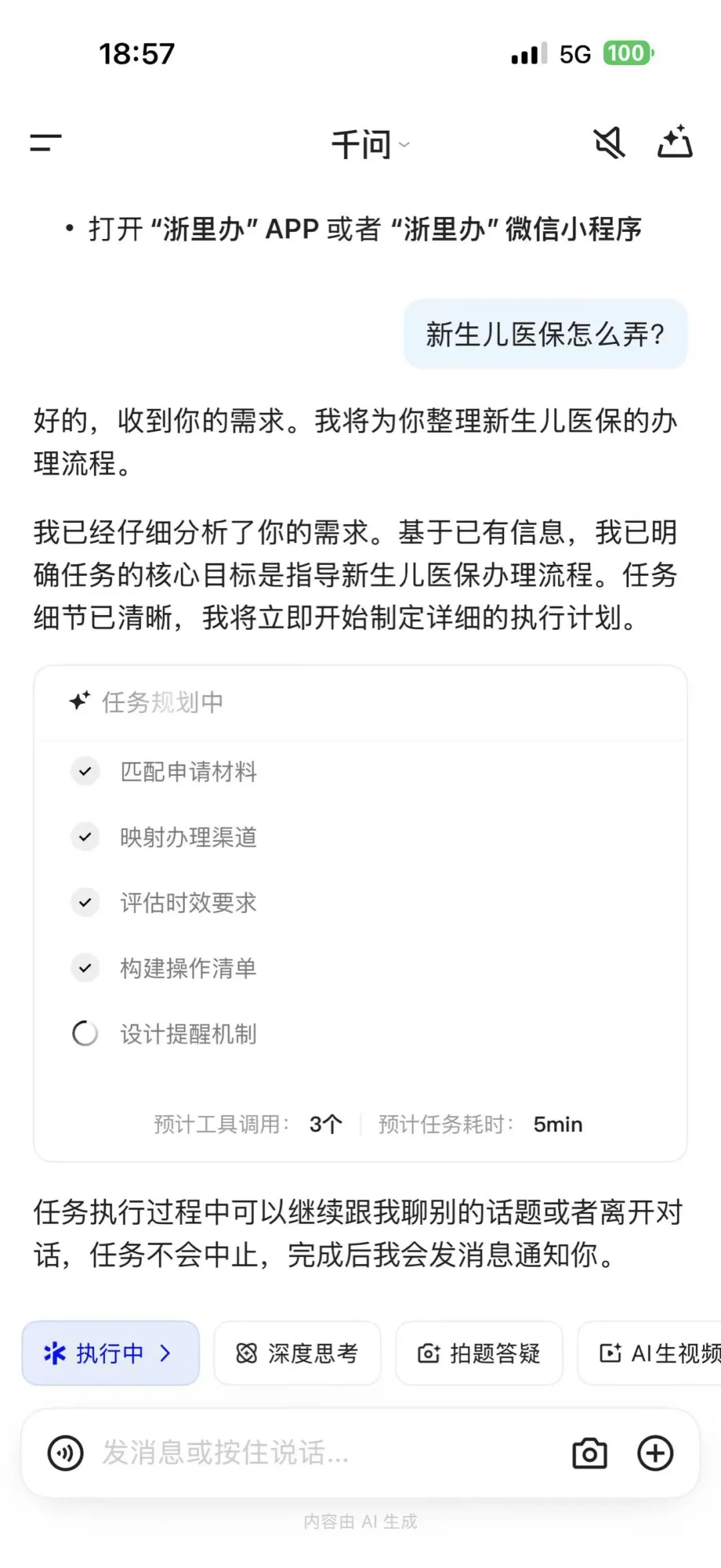 办新生儿医保时,会提示 “匹配申请材料→映射办理渠道→构建操作清单”,标注 “预计耗时 5 分钟”;