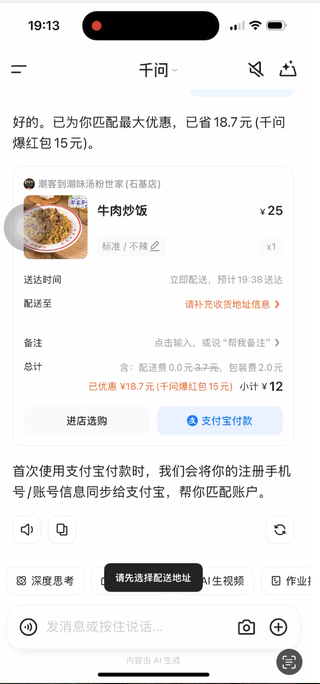 订外卖:输入 “想吃牛肉炒饭”,系统自动叠加红包,比自己开会员下单省 22.7 元,确认地址就能坐等送达