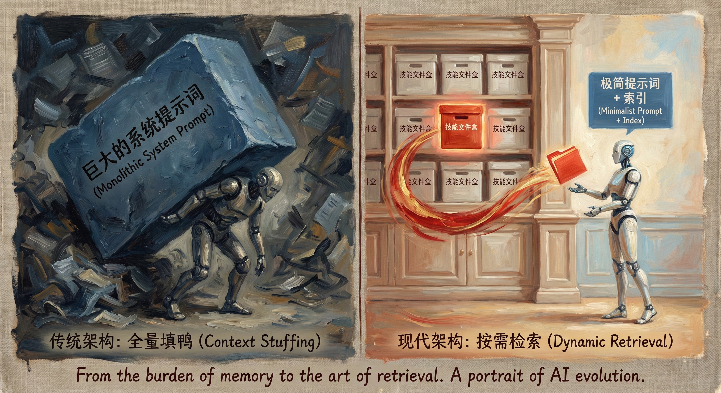 Claude Skills这种“基于文件系统的动态上下文(Filesystem-based Dynamic Context)”机制,彻底打破了传统 Agent 开发中“单一长文本 System Prompt”的统治地位,将 Agent 的“大脑”从一个静态的规则集合转变为一个按需加载、动态重组的“图书馆”。
