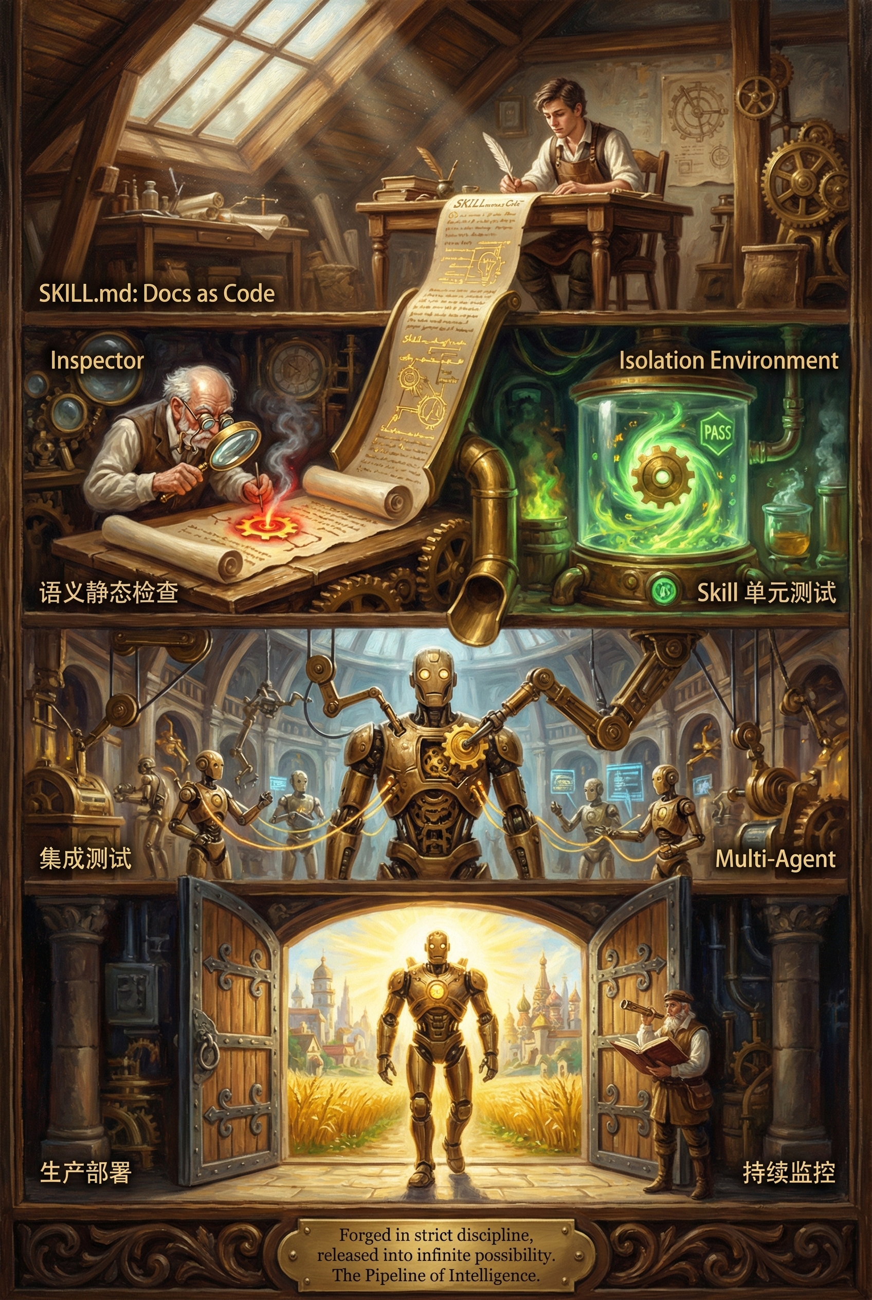 在 Claude Skills 架构下,文档就是代码。SKILL.md 中的每一行 Markdown 文本,本质上都是一段可执行的逻辑。因此,我们必须引入软件工程中的 CI/CD 理念来管理 Prompt。我们不再只评测模型,我们要评测Skill文档的质量。