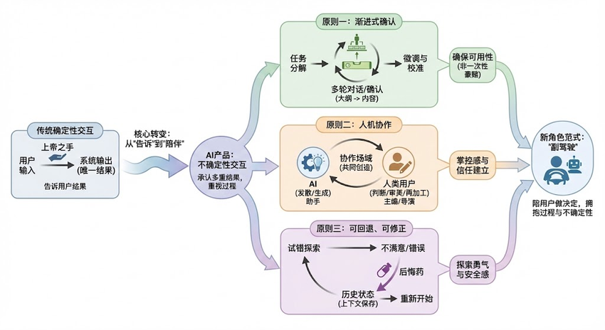 这种可回退、可修正的设计,给了用户探索和试错的勇气。他知道自己可以大胆地尝试AI的各种建议,因为即使走错了路,也总能找到回来的路。这种安全感,是不确定性交互设计的基石