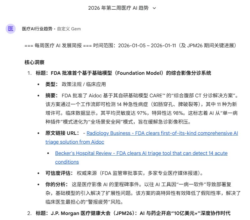 然后你可以直接问它:“帮我总结 2026 年第二周的医疗 AI 趋势。”它就会给你一份真正可用的行业周报。