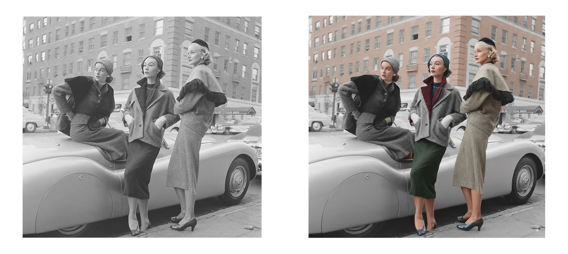 20 世纪 50 年代的女性,妮娜・利恩(Nina Leen)拍摄的原始黑白照片前后对比。