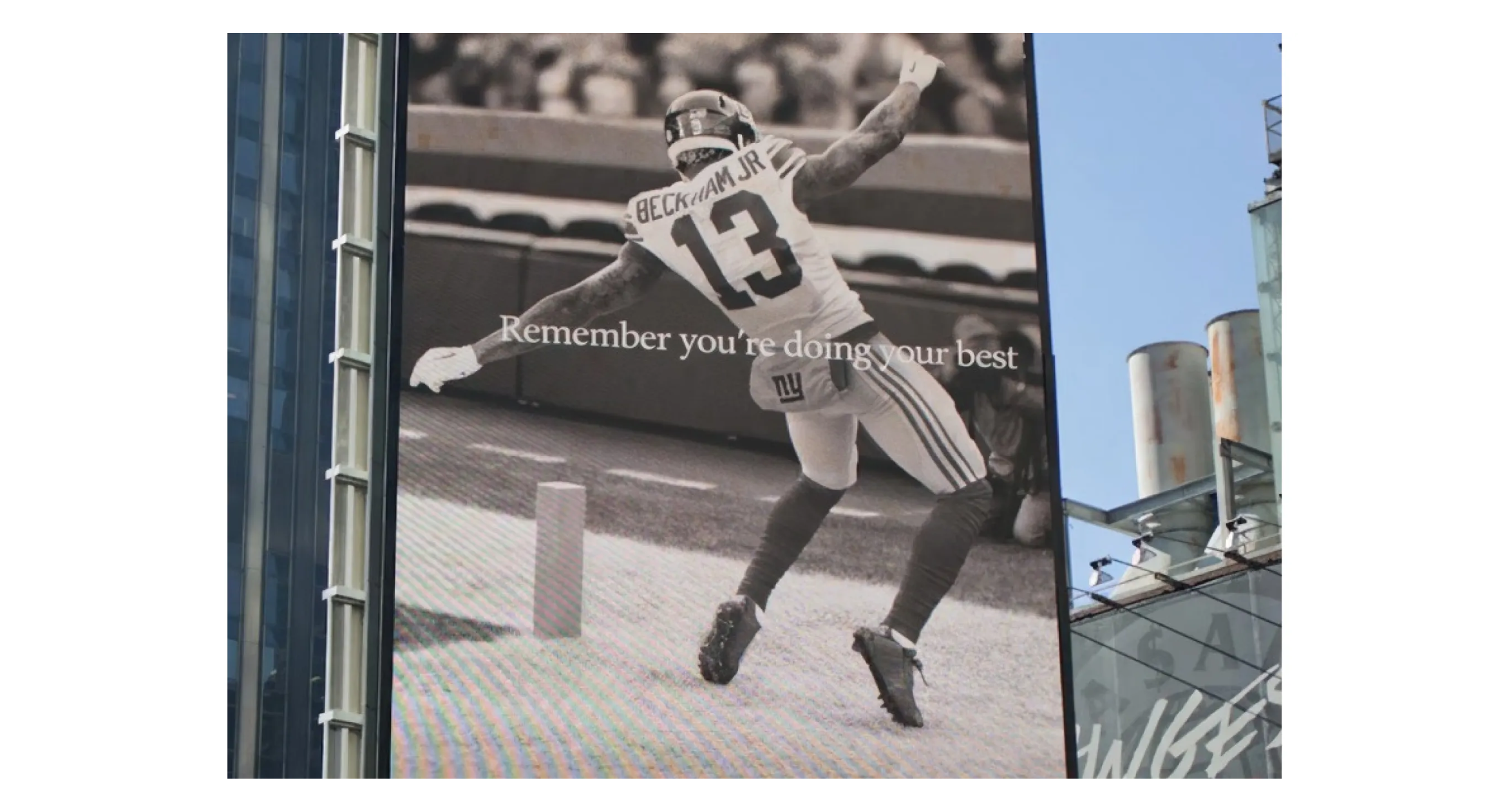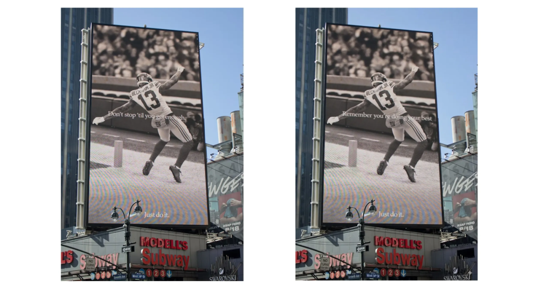 提示词:将广告牌上 “不满足不停歇” 的文字改为 “记住你已竭尽全力”。