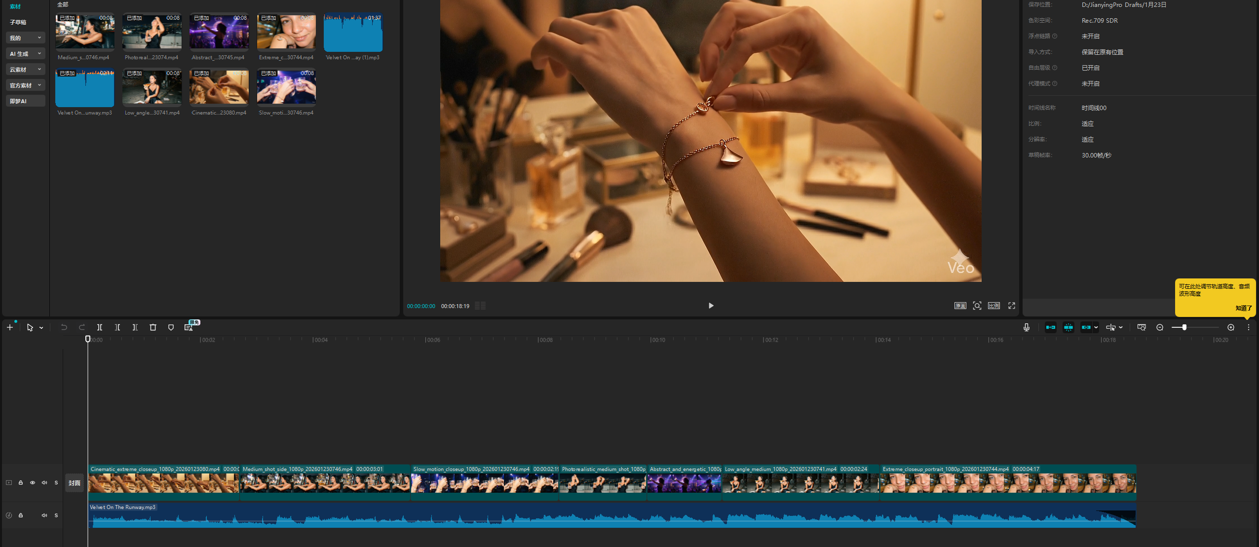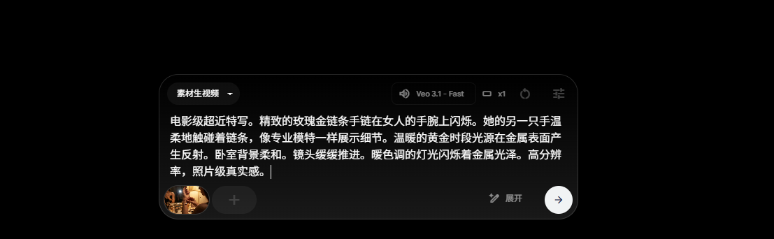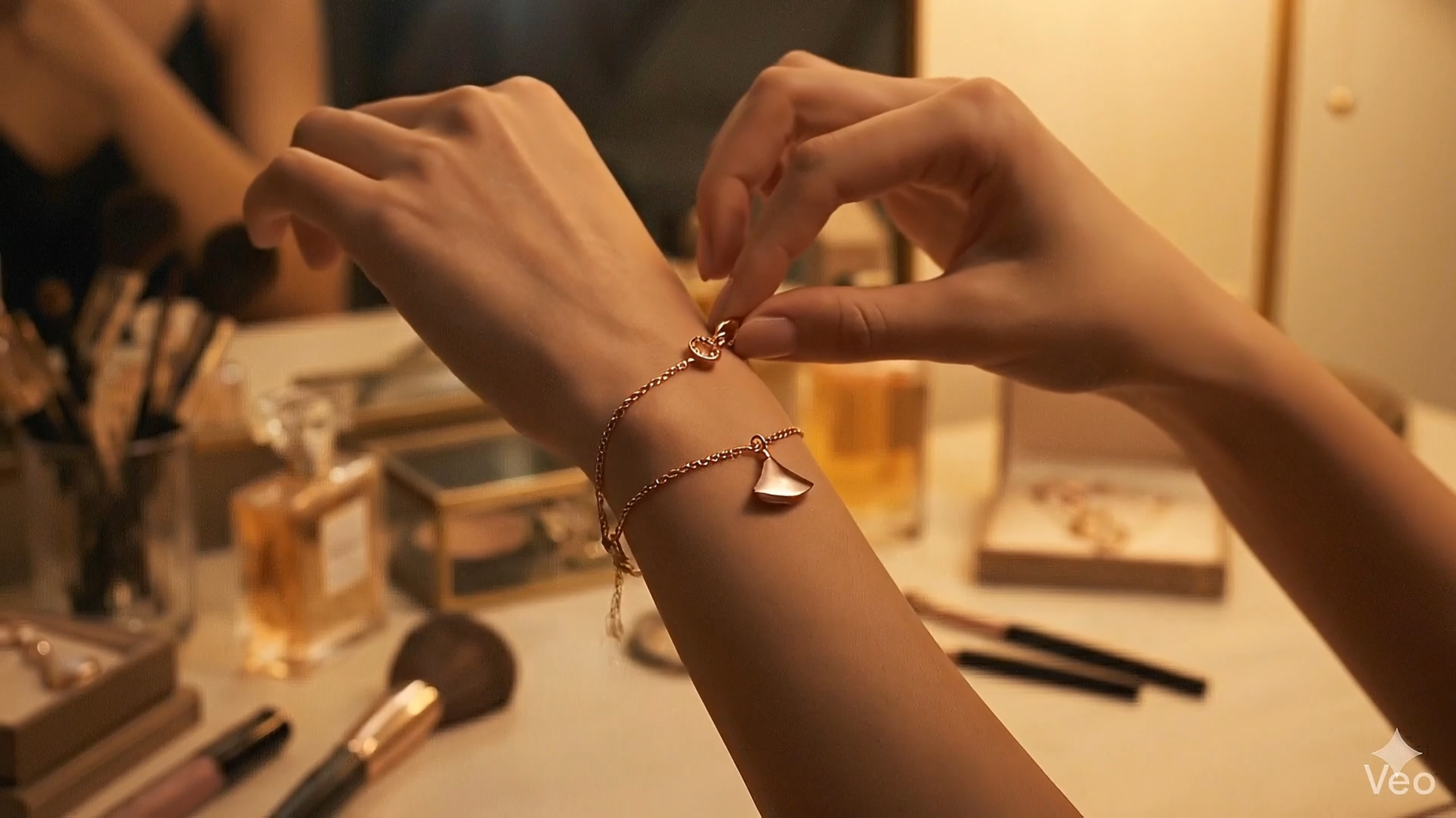 我们的第一个提示词是,一位年轻女子正在将一条宝格丽玫瑰金双链手链戴在手腕上。手链扣上“咔哒”一声的瞬间。光线昏暗的卧室梳妆台,略显凌乱,摆放着化妆刷和香水瓶。镜子中的倒影隐约可见她黑色吊带裙的轮廓。这是一个很好的开场镜头。