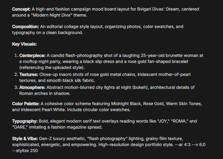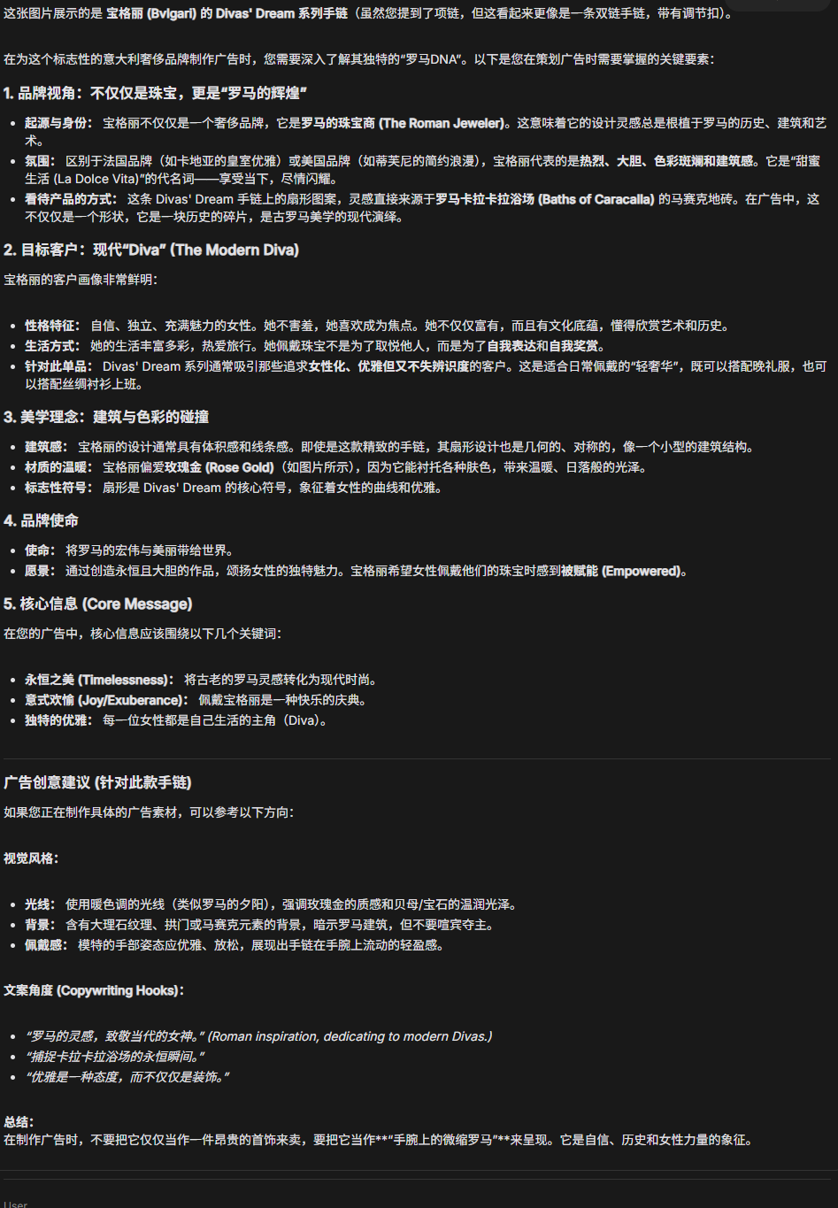 Gemini 3 Pro会为我们做大量大调研,这将有助于把这则广告整合成统一且契合宝格丽品牌的整体形象。不希望这只是随意拼凑的,实际上希望在每一个环节都非常有目的性。
