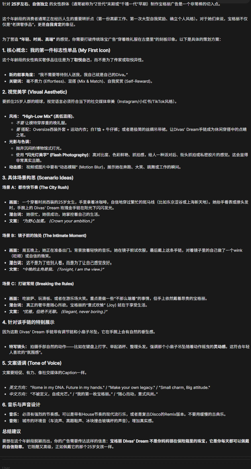 我觉得制作一个针对自信、独立、充满魅力的年轻女性人群的广告会很有趣,比如25岁左右的人。我希望它能给人一种,年轻,时尚的感觉。
