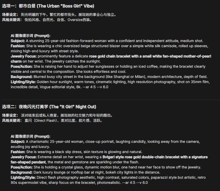- 多维生成: 生成三种完全不同的氛围——“高冷极简风”、“奢华宫廷风”、“自然森系风”。