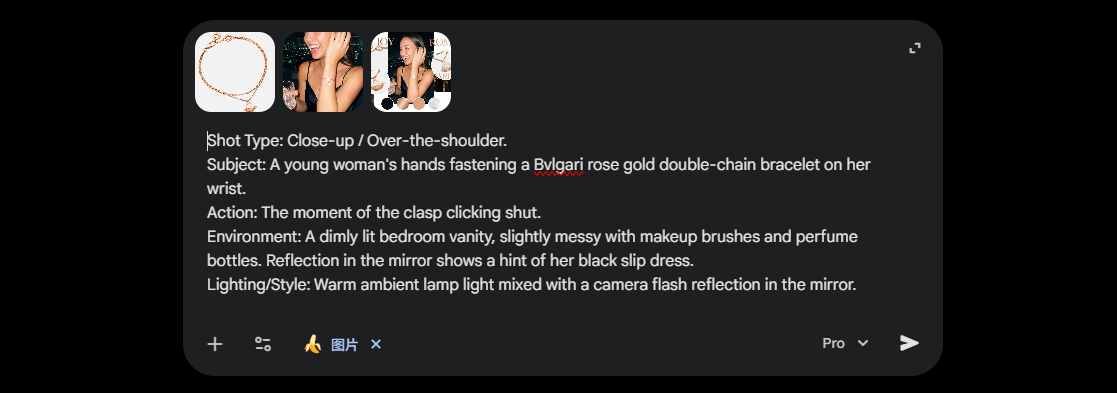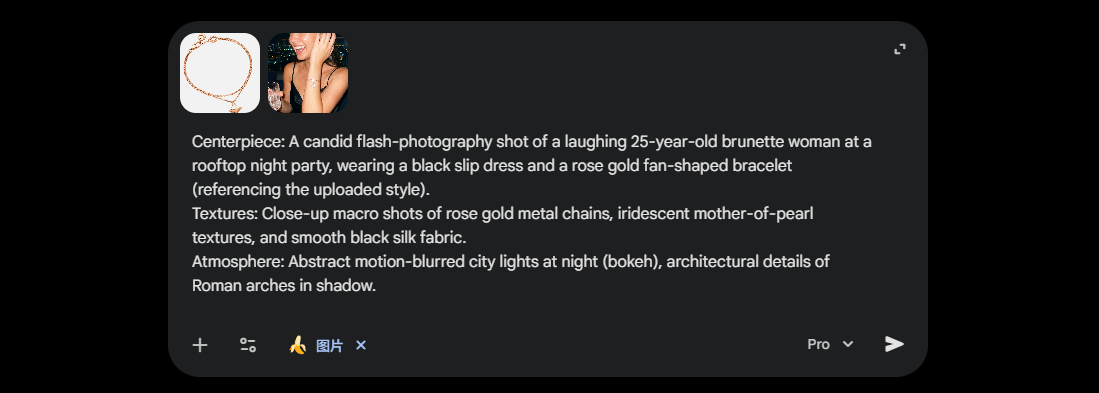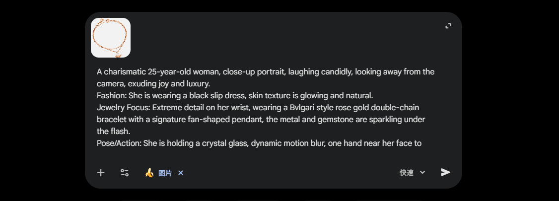 接下来将产品图粘贴进 Google AI Studio。不要直接对AI说“生成一个手链广告”。作为PM,我们需要定义参数。