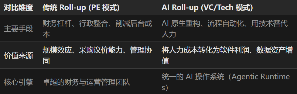 为了更清晰地理解 AI Roll-up 的颠覆性,我们有必要将其与传统的私募股权(PE)Roll-up 模式进行对比。两者虽然都采用并购整合的手段,但其核心驱动力、价值来源和技术底座已截然不同。